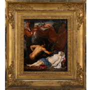 ![]() | LOT.329 マイセン 色絵陶板「ユピテルとアンティオペ」 23.5×19.8cm(額寸38.5×35.0cm) 裏に窯印 原画:Thomas Willeboirts Bosschaert エスティメイト:20万円~30万円 |